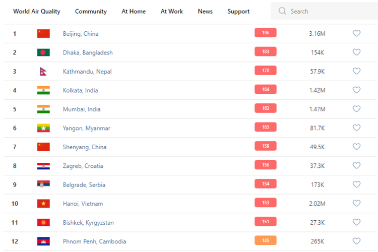 В рейтинге крупнейших городов мира по качеству воздуха World Air Quality Бишкек поднялся на 11-е место.