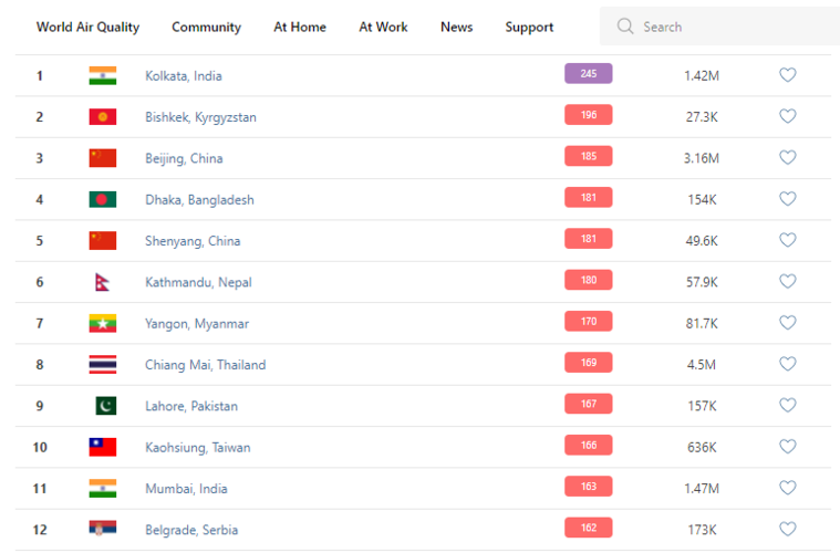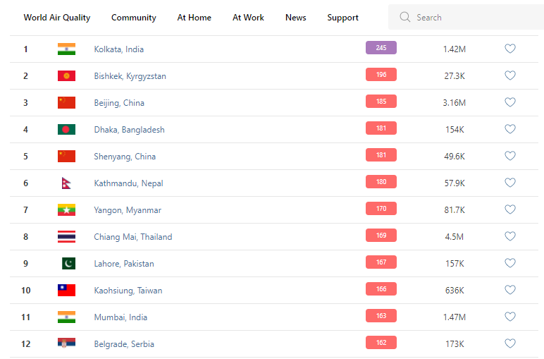 В рейтинге крупнейших городов мира по качеству воздуха World Air Quality Бишкек поднялся на 2-е место.