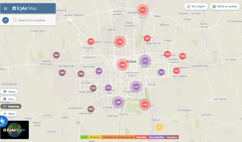 Общественный фонд «Институт экологических решений» установил датчики в столице и пригороде. На карте можно увидеть среднее значение AQI в разных районах Бишкека. Его обновляют ежечасно.