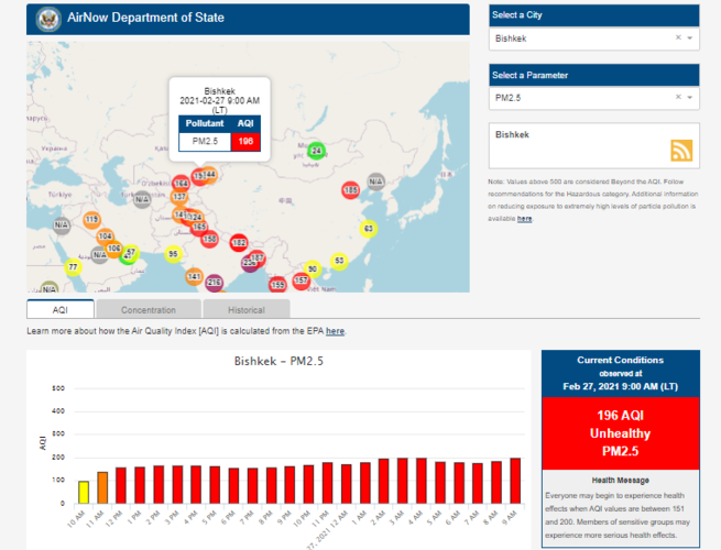 Посольство США в Кыргызстане также установило датчик. Информация обновляется каждый час. На 9.00 индекс качества воздуха в районе дипломатической миссии — 196 (AQI).