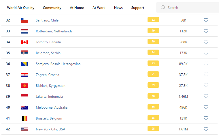 В рейтинге крупнейших городов мира по качеству воздуха World Air Quality Бишкек опустился на 38-е место.