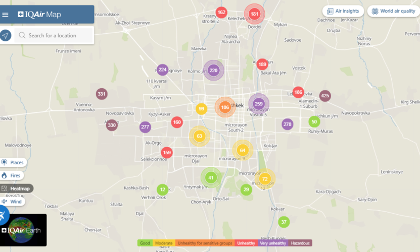 Общественный фонд «Институт экологических решений» установил датчики в столице и пригороде. На карте можно увидеть среднее значение AQI в разных районах Бишкека. Его обновляют ежечасно.