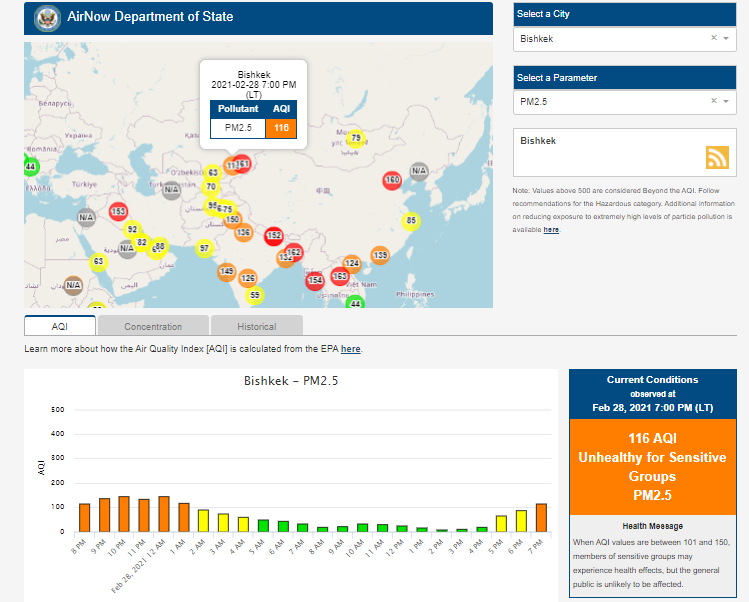 Посольство США в Кыргызстане также установило датчик. Информация обновляется каждый час. На 19.00 индекс качества воздуха в районе дипломатической миссии — 116 (AQI).