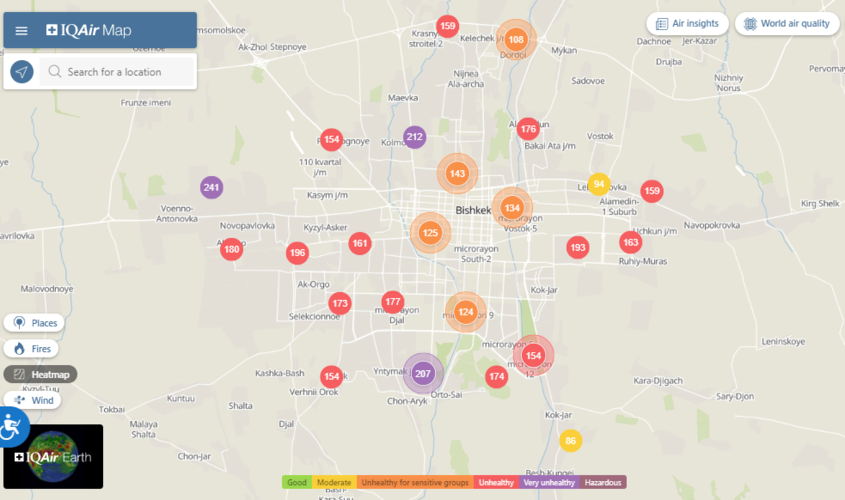 Общественный фонд «Институт экологических решений» установил датчики в столице и пригороде. На карте можно увидеть среднее значение AQI в разных районах Бишкека. Его обновляют ежечасно.
