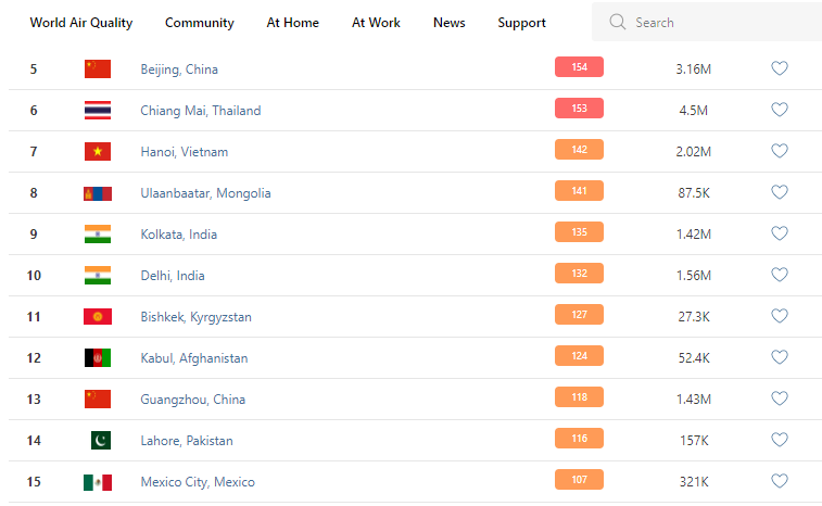 В рейтинге крупнейших городов мира по качеству воздуха World Air Quality Бишкек поднялся на 11-е место.