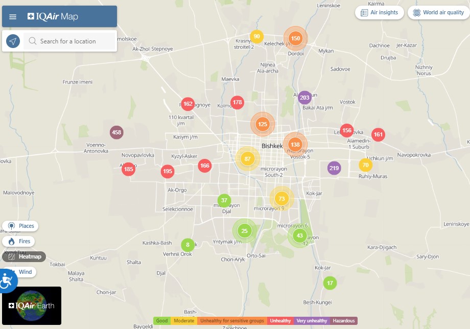Общественный фонд «Институт экологических решений» установил датчики в столице и пригороде. На карте можно увидеть среднее значение AQI в разных районах Бишкека. Его обновляют ежечасно.