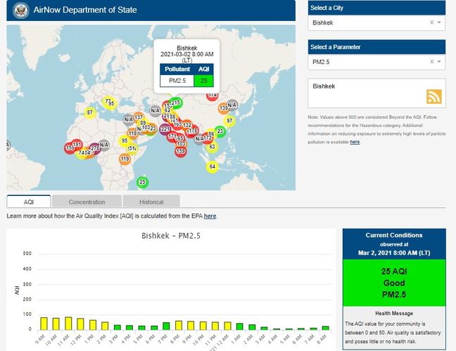 Посольство США в Кыргызстане также установило датчик. Информация обновляется каждый час. На 8.00 индекс качества воздуха в районе дипломатической миссии — 25 (AQI).