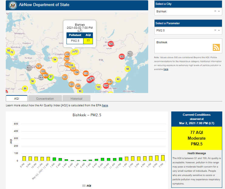 Посольство США в Кыргызстане также установило датчик. Информация обновляется каждый час. На 19.00 индекс качества воздуха в районе дипломатической миссии — 77 (AQI).