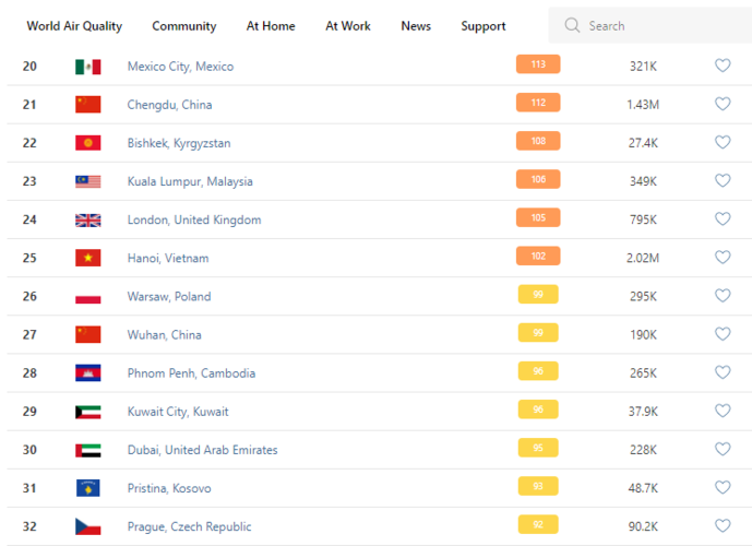 В рейтинге крупнейших городов мира по качеству воздуха World Air Quality Бишкек поднялся на 22-е место.