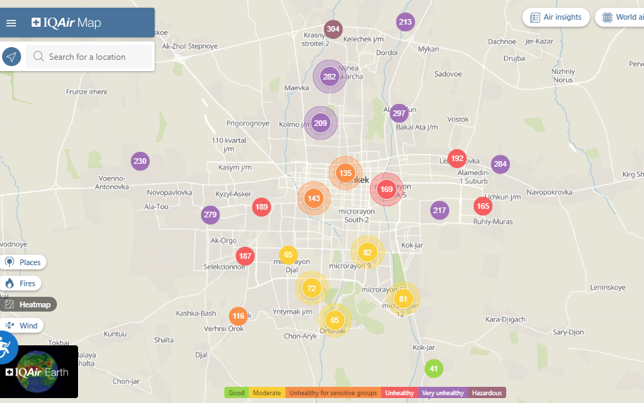Общественный фонд «Институт экологических решений» установил датчики в столице и пригороде. На карте можно увидеть среднее значение AQI в разных районах Бишкека. Его обновляют ежечасно.