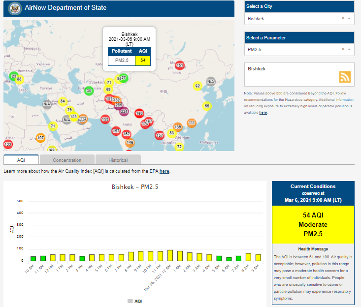 Посольство США в Кыргызстане также установило датчик. Информация обновляется каждый час. На 8.00 индекс качества воздуха в районе дипломатической миссии — 54 (AQI).