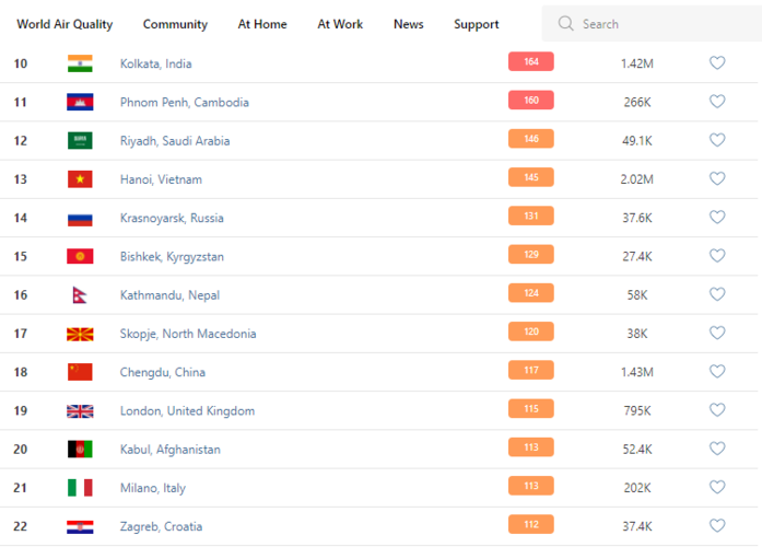 В рейтинге крупнейших городов мира по качеству воздуха World Air Quality Бишкек поднялся на 15-е место.