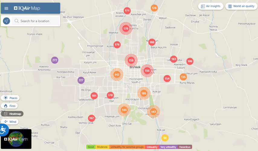 Общественный фонд «Институт экологических решений» установил датчики в столице и пригороде. На карте можно увидеть среднее значение AQI в разных районах Бишкека. Его обновляют ежечасно.