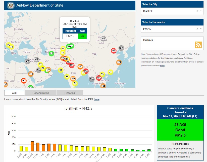 Посольство США в Кыргызстане также установило датчик. Информация обновляется каждый час. На 8.00 индекс качества воздуха в районе дипломатической миссии — 26 (AQI).