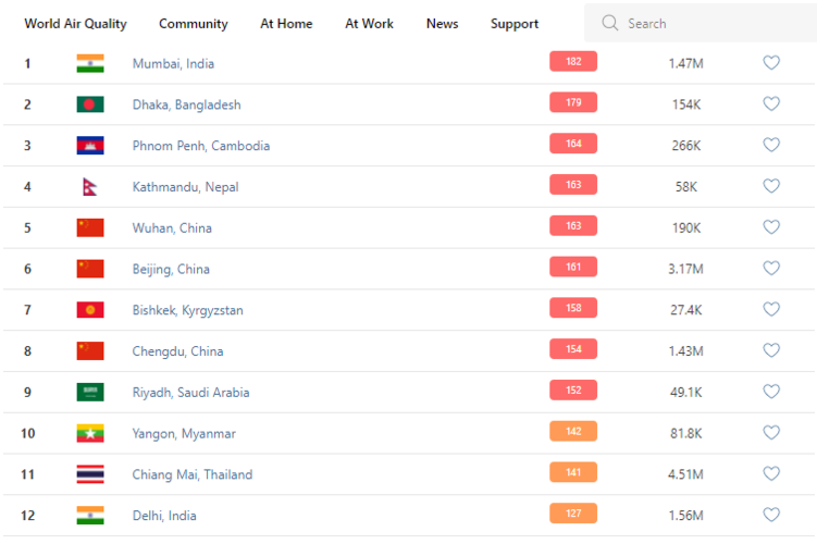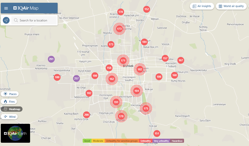 В рейтинге крупнейших городов мира по качеству воздуха World Air Quality Бишкек поднялся на 7-е место.