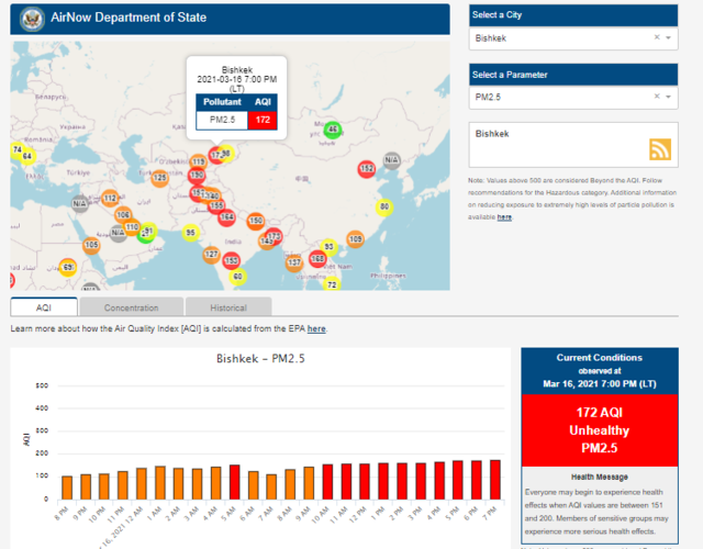 Посольство США в Кыргызстане также установило датчик. Информация обновляется каждый час. На 19.00 индекс качества воздуха в районе дипломатической миссии — 131 (AQI).
