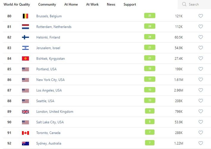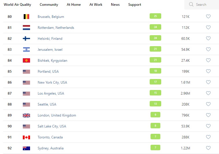 В рейтинге крупнейших городов мира по качеству воздуха World Air Quality Бишкек опустился на 84-е место.