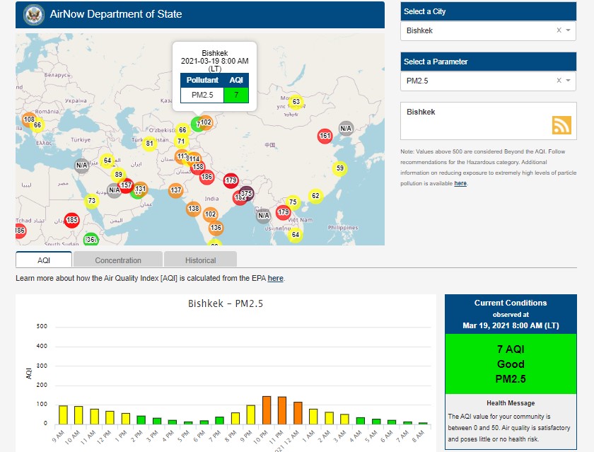 Посольство США в Кыргызстане также установило датчик. Информация обновляется каждый час. На 8.00 индекс качества воздуха в районе дипломатической миссии — 7 (AQI).