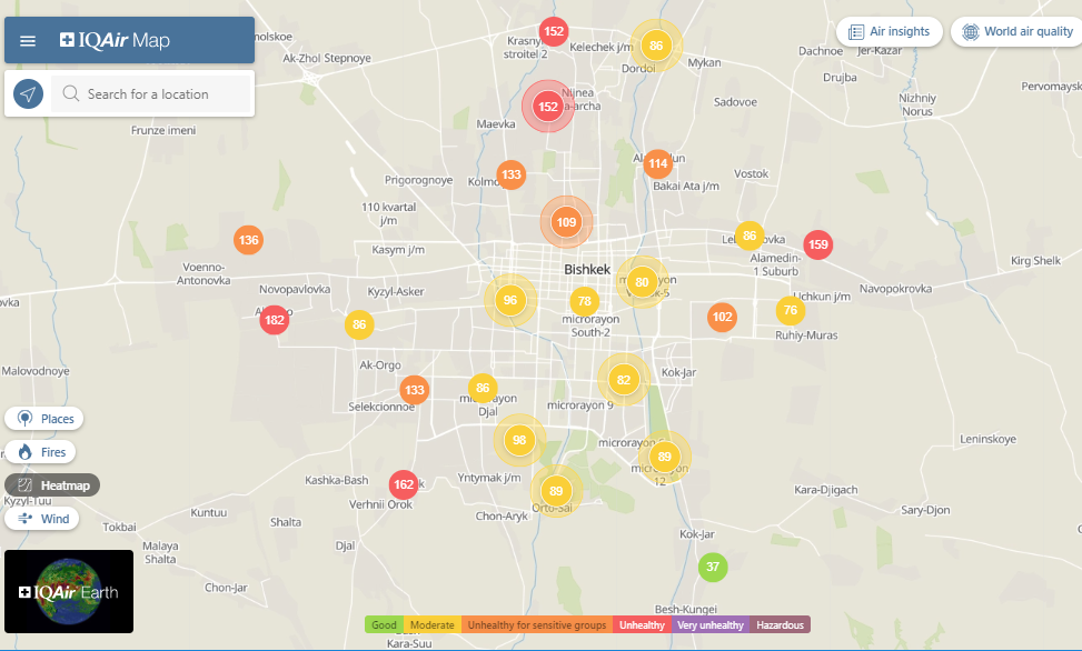 Общественный фонд «Институт экологических решений» установил датчики в столице и пригороде. На карте можно увидеть среднее значение AQI в разных районах Бишкека. Его обновляют ежечасно.
