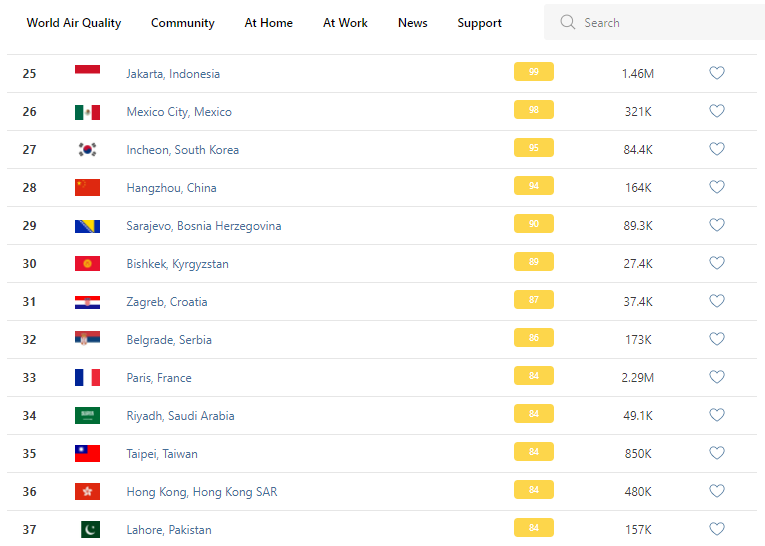 В рейтинге крупнейших городов мира по качеству воздуха World Air Quality Бишкек поднялся на 30-е место.