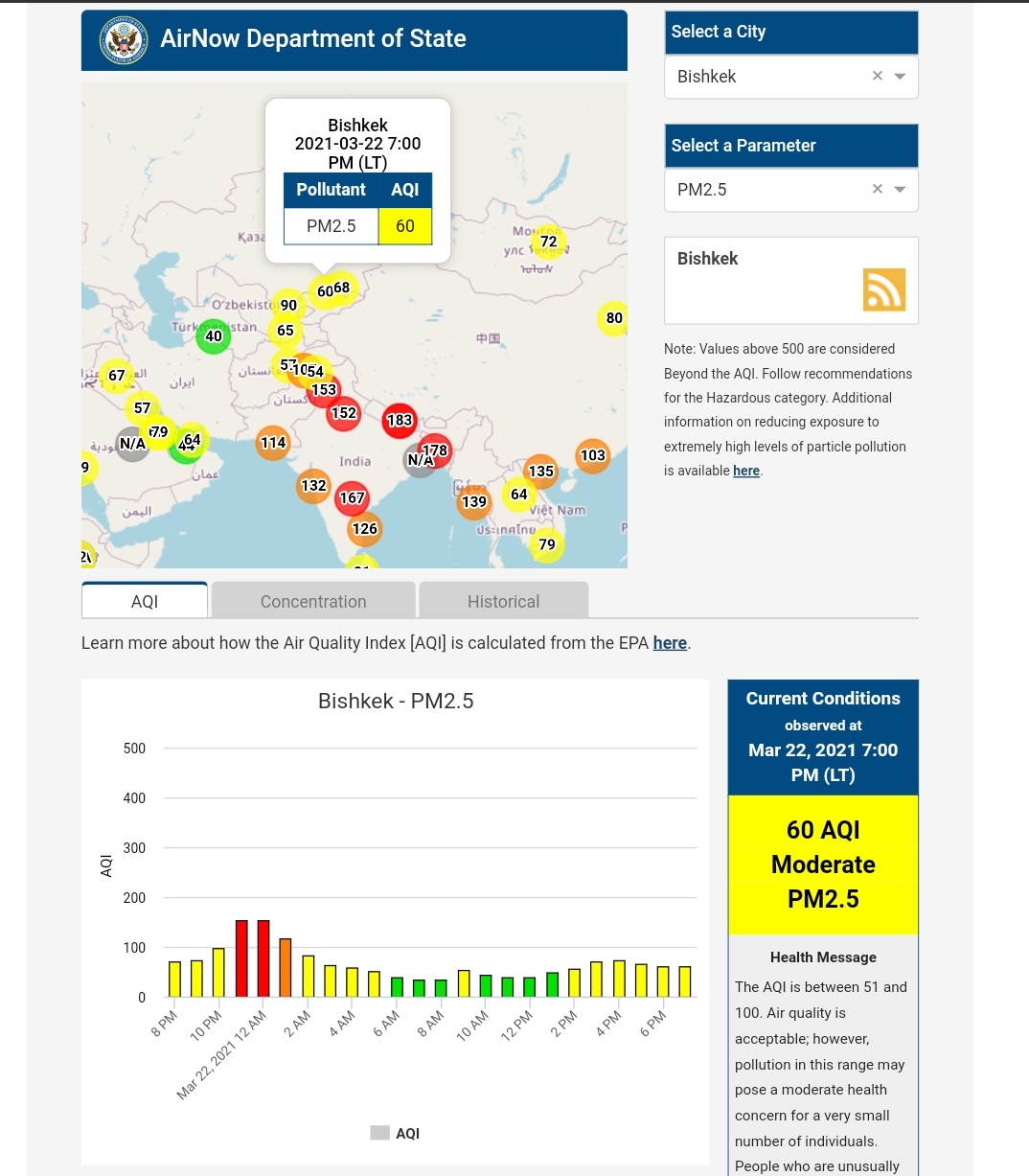 Посольство США в Кыргызстане также установило датчик. Информация обновляется каждый час. На 19.00 индекс качества воздуха в районе дипломатической миссии — 60 (AQI).