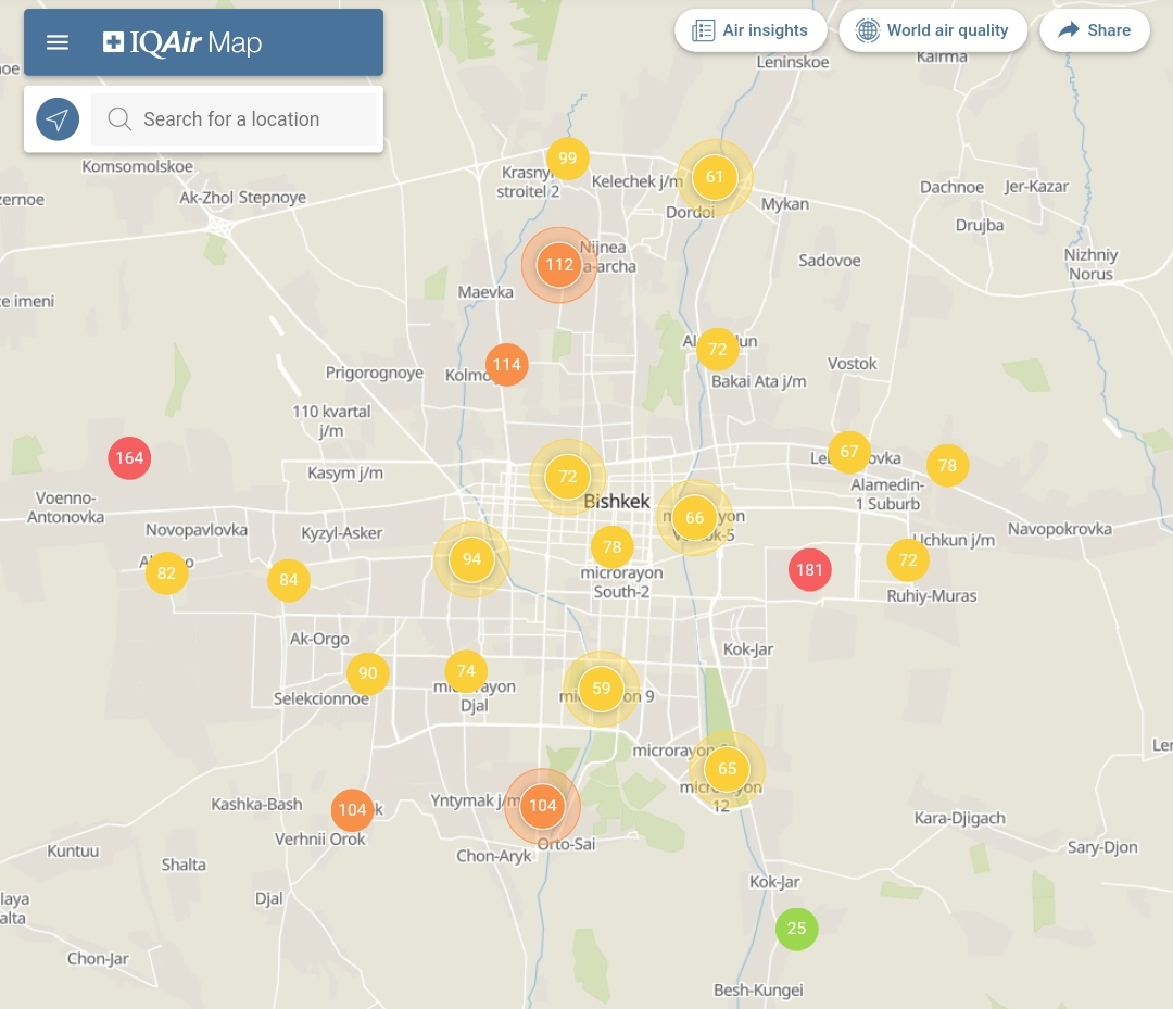 Общественный фонд «Институт экологических решений» установил датчики в столице и пригороде. На карте можно увидеть среднее значение AQI в разных районах Бишкека. Его обновляют ежечасно.