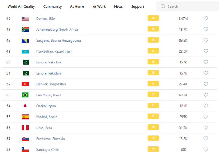 В рейтинге крупнейших городов мира по качеству воздуха World Air Quality Бишкек опустился на 52-е место.