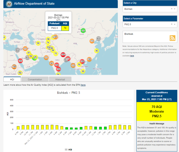 Посольство США в Кыргызстане также установило датчик. Информация обновляется каждый час. На 19.00 индекс качества воздуха в районе дипломатической миссии — 70 (AQI).
