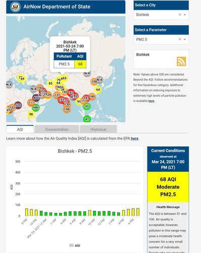 Посольство США в Кыргызстане также установило датчик. Информация обновляется каждый час. На 19.00 индекс качества воздуха в районе дипломатической миссии — 68 (AQI).