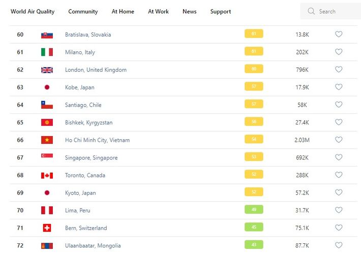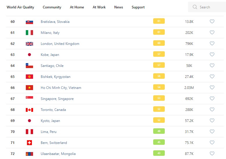 В рейтинге крупнейших городов мира по качеству воздуха World Air Quality Бишкек опустился на 65-е место.