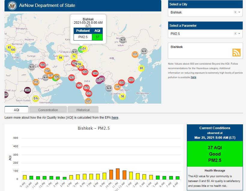 Посольство США в Кыргызстане также установило датчик. Информация обновляется каждый час. На 8.00 индекс качества воздуха в районе дипломатической миссии — 37 (AQI).
