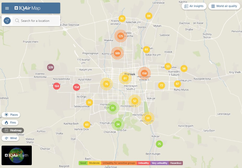 Общественный фонд «Институт экологических решений» установил датчики в столице и пригороде. На карте можно увидеть среднее значение AQI в разных районах Бишкека. Его обновляют ежечасно.