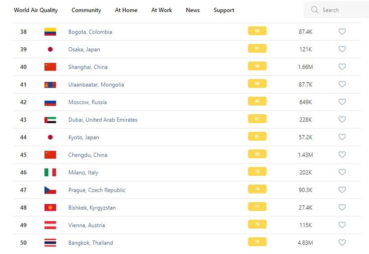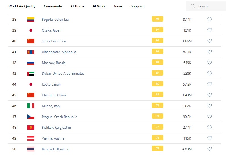В рейтинге крупнейших городов мира по качеству воздуха World Air Quality Бишкек поднялся на 48-е место.
