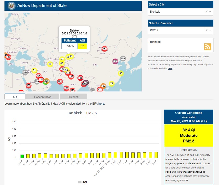 Посольство США в Кыргызстане также установило датчик. Информация обновляется каждый час. На 8.00 индекс качества воздуха в районе дипломатической миссии — 82 (AQI).