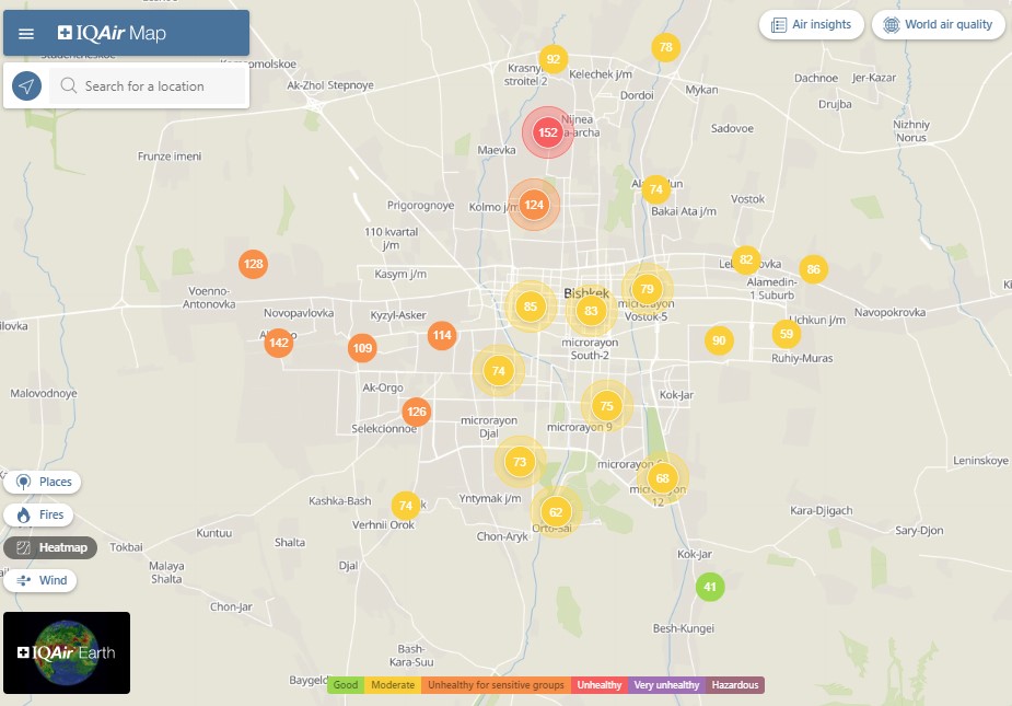 Общественный фонд «Институт экологических решений» установил датчики в столице и пригороде. На карте можно увидеть среднее значение AQI в разных районах Бишкека. Его обновляют ежечасно.