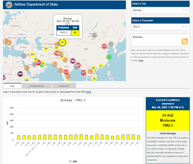Посольство США в Кыргызстане также установило датчик. Информация обновляется каждый час. На 19.00 индекс качества воздуха в районе дипломатической миссии — 69 (AQI).
