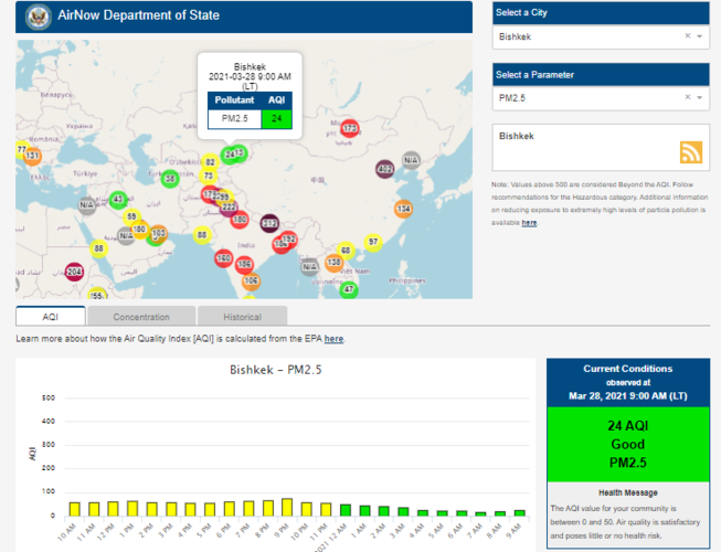 Посольство США в Кыргызстане также установило датчик. Информация обновляется каждый час. На 9.00 индекс качества воздуха в районе дипломатической миссии — 24 (AQI).
