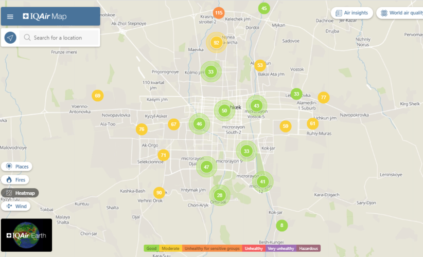 Общественный фонд «Институт экологических решений» установил датчики в столице и пригороде. На карте можно увидеть среднее значение AQI в разных районах Бишкека. Его обновляют ежечасно.