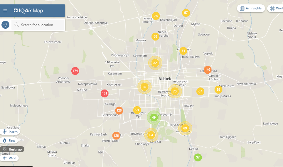 Общественный фонд «Институт экологических решений» установил датчики в столице и пригороде. На карте можно увидеть среднее значение AQI в разных районах Бишкека. Его обновляют ежечасно.