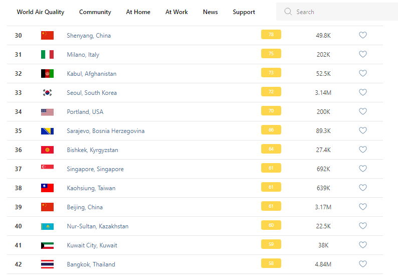 В рейтинге крупнейших городов мира по качеству воздуха World Air Quality Бишкек поднялся на 36-е место.
