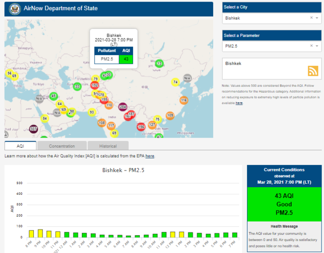Посольство США в Кыргызстане также установило датчик. Информация обновляется каждый час. На 19.00 индекс качества воздуха в районе дипломатической миссии — 43 (AQI).