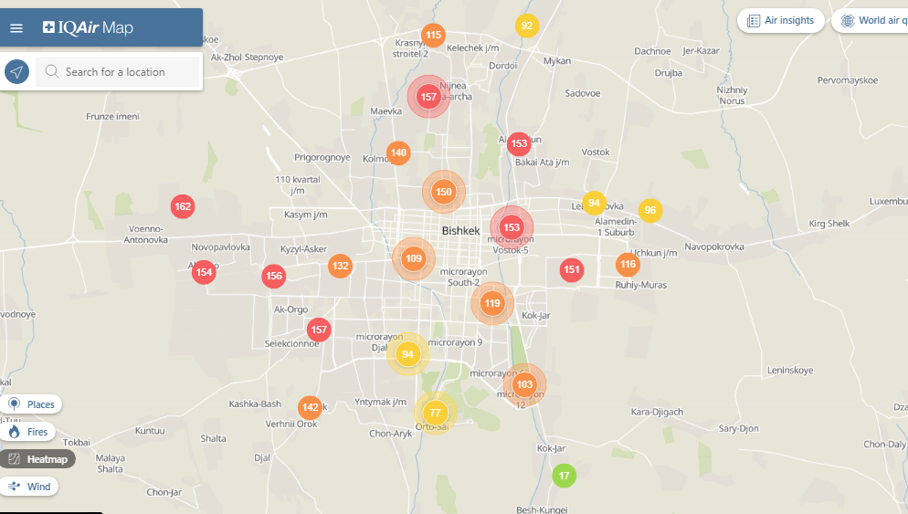 Общественный фонд «Институт экологических решений» установил датчики в столице и пригороде. На карте можно увидеть среднее значение AQI в разных районах Бишкека. Его обновляют ежечасно.