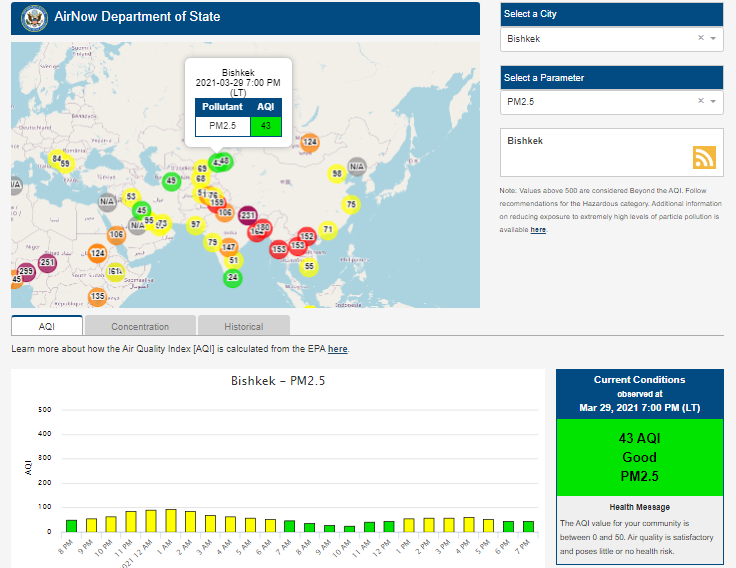 Посольство США в Кыргызстане также установило датчик. Информация обновляется каждый час. На 19.00 индекс качества воздуха в районе дипломатической миссии — 43 (AQI).