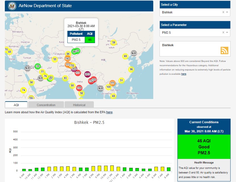 Посольство США в Кыргызстане также установило датчик. Информация обновляется каждый час. На 8.00 индекс качества воздуха в районе дипломатической миссии — 46 (AQI).