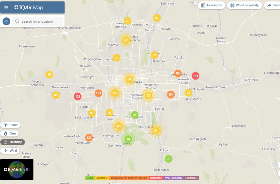Общественный фонд «Институт экологических решений» установил датчики в столице и пригороде. На карте можно увидеть среднее значение AQI в разных районах Бишкека. Его обновляют ежечасно.
