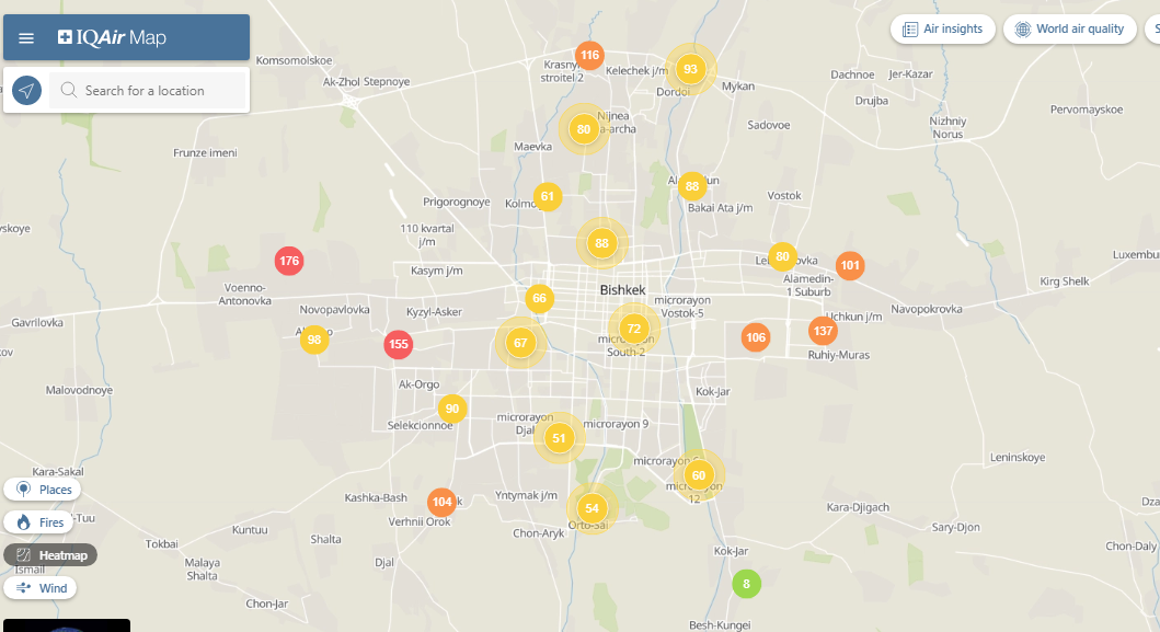 Общественный фонд «Институт экологических решений» установил датчики в столице и пригороде. На карте можно увидеть среднее значение AQI в разных районах Бишкека. Его обновляют ежечасно.
