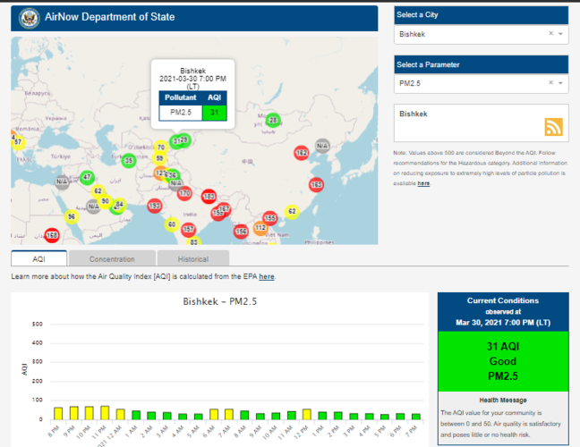 Посольство США в Кыргызстане также установило датчик. Информация обновляется каждый час. На 19.00 индекс качества воздуха в районе дипломатической миссии — 31 (AQI).