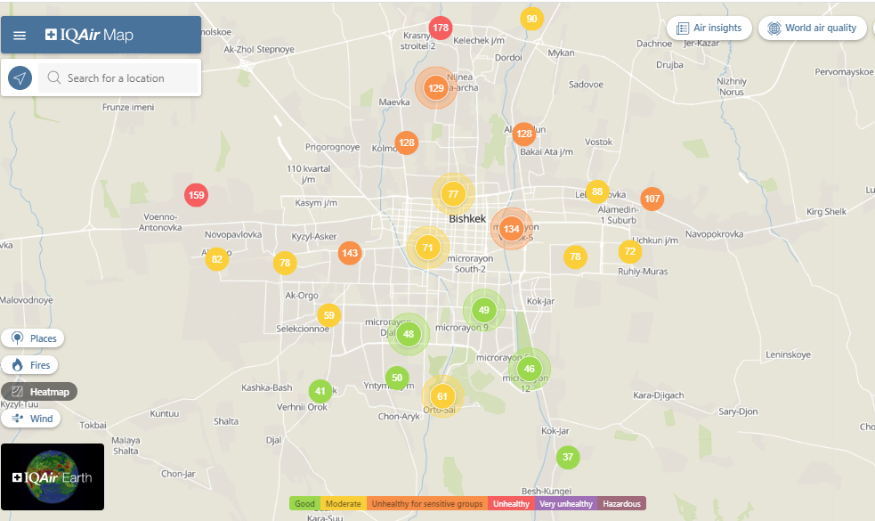 Общественный фонд «Институт экологических решений» установил датчики в столице и пригороде. На карте можно увидеть среднее значение AQI в разных районах Бишкека. Его обновляют ежечасно.