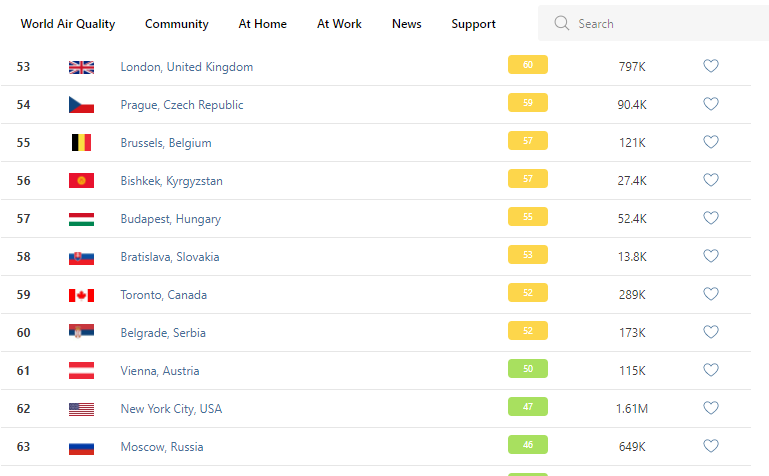 В рейтинге крупнейших городов мира по качеству воздуха World Air Quality Бишкек опустился на 56-е место.