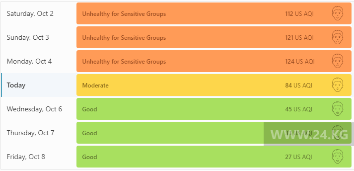 Сегодня статус города отмечен как «умеренный». Индекс качества воздуха, по данным сайта, составляет 84 (AQI), однако последние три дня это значение было гораздо выше — от 112 до 124 (AQI).